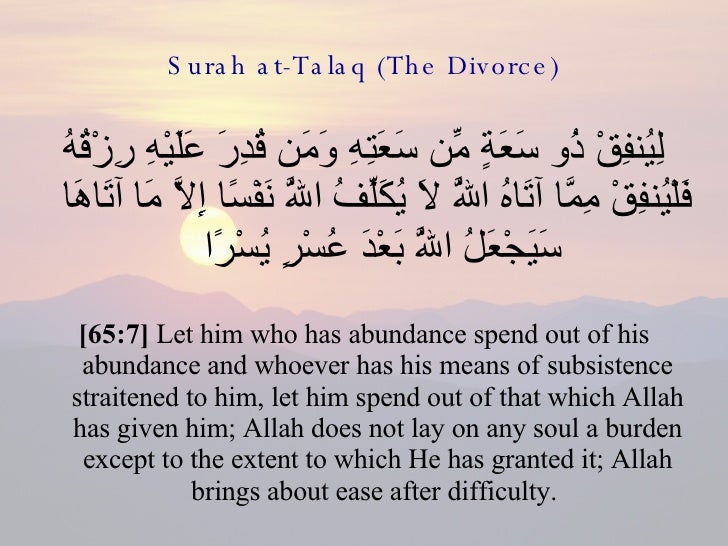 «آنان که دارا هستند از داريي خرج کنند و آنان که تنگدست هستند از چيزي که خدا بديشان داده است، خرج کنند. خداوند هيچ کسي را جز بدان اندازه که بدو داده است، مکلف نمي سازد؛ خداوند بعد از سختي و ناخوشي، گشايش و خوشي پيش مي آورد».